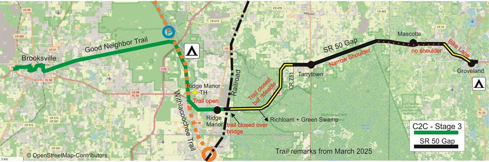 This gap is 28 miles. In the east from Groveland to Tarrytown it is a 2-lane road with shoulder, sometimes very narrow. West of Tarrytown is construction in progress to widen to a 4-lane road with bike trail. For most of these 12 miles the trail is paved, but barricaded. Riders do go around and use it. Only over the new railroad bridge the trail is heavily barricaded.